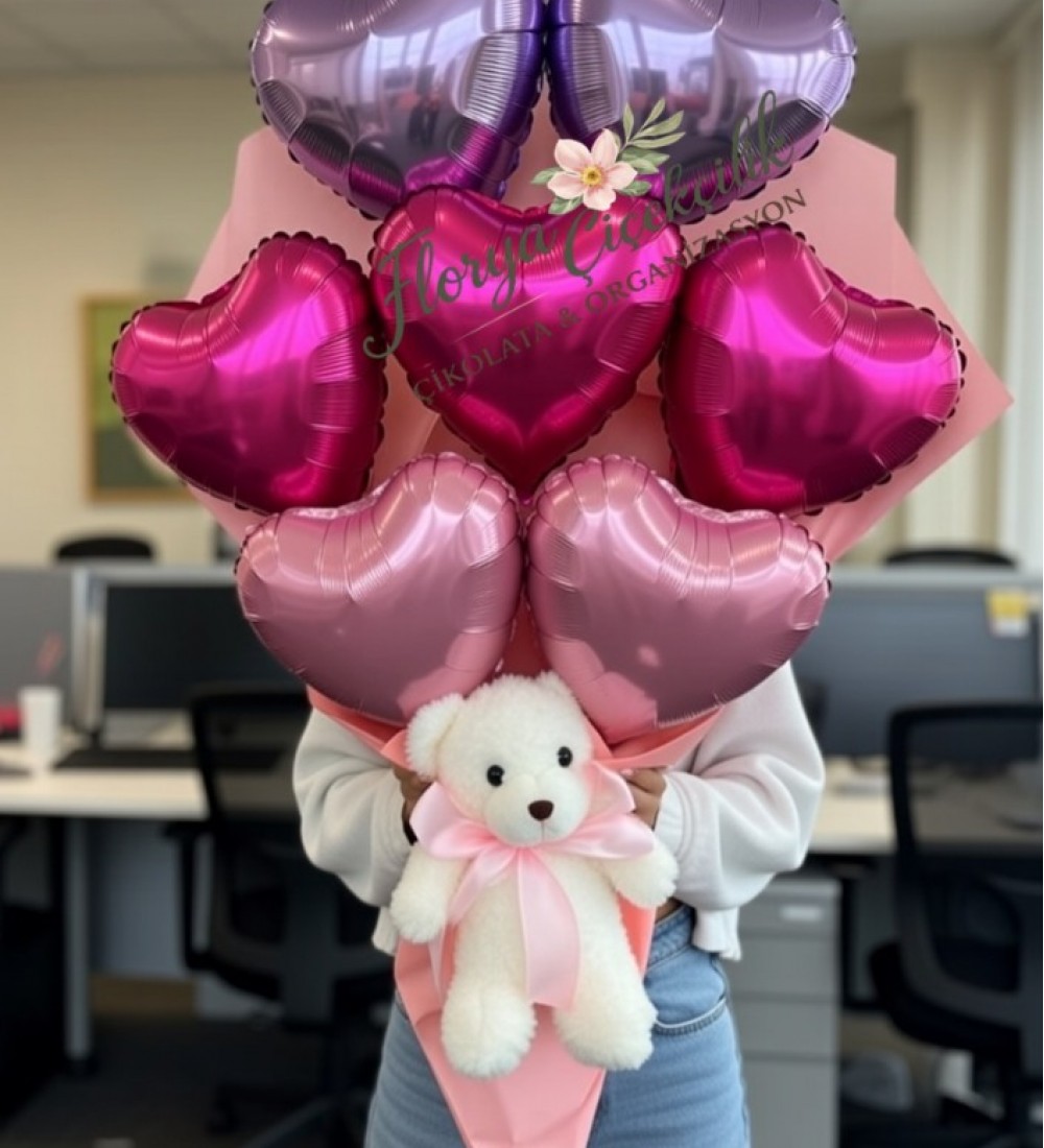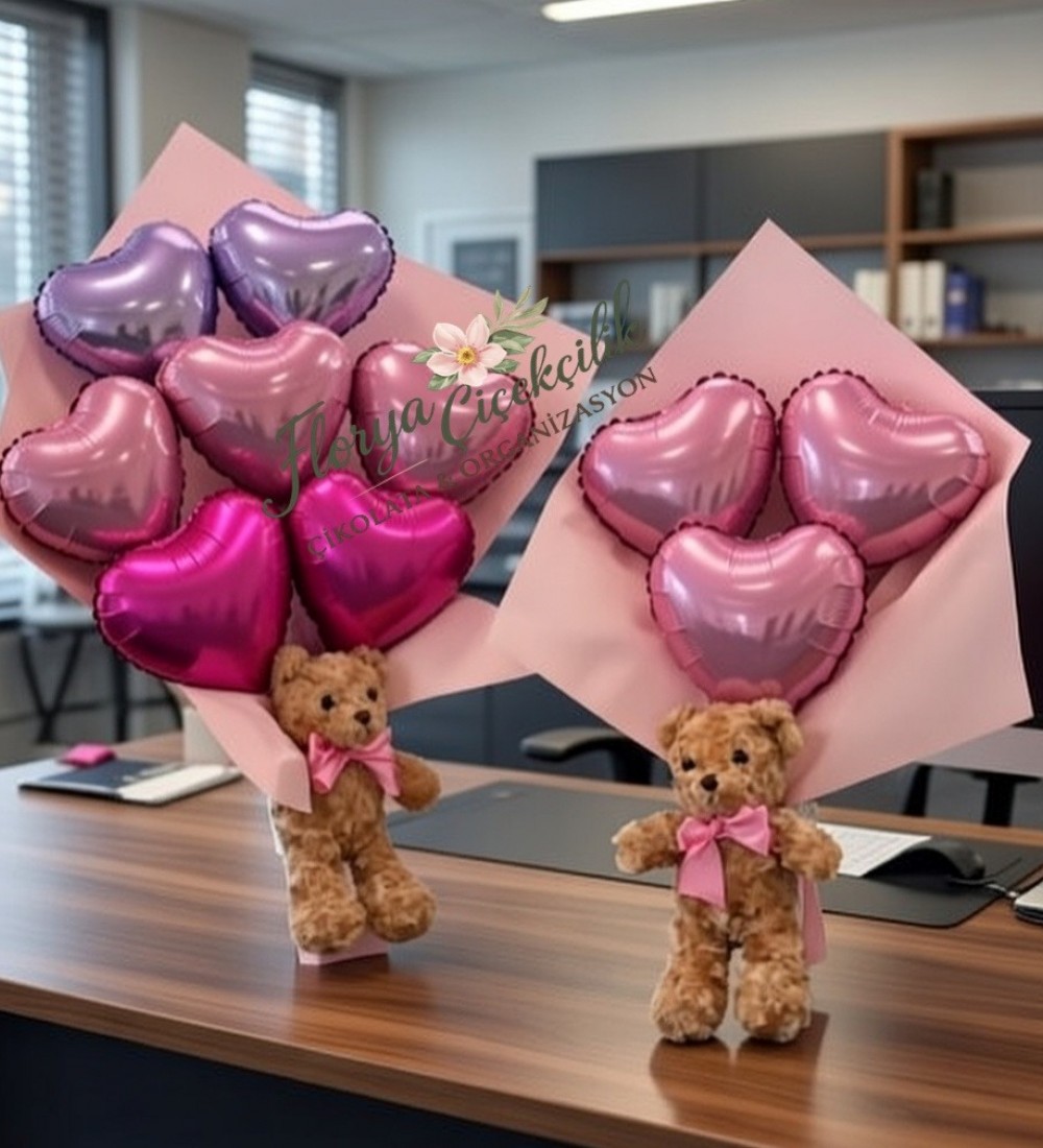 Sevgililer Günü Kalp Balon Buketi & Peluş Ayıcık – Romantik Hediye