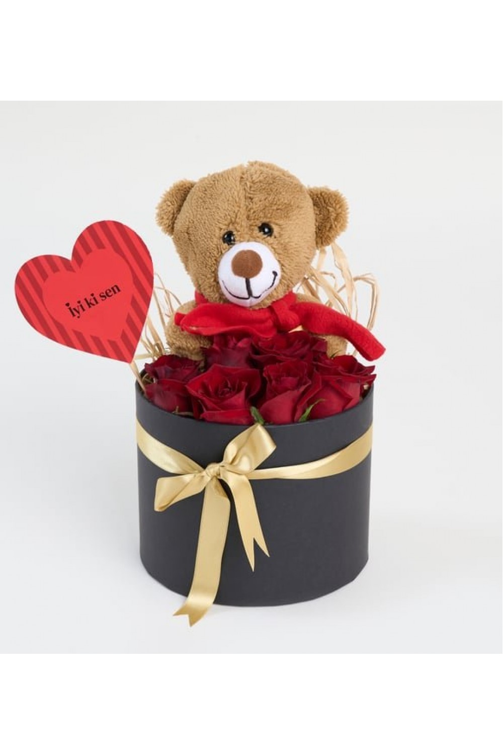 Siyah kutunun asaletiyle kırmızı güllerin tutkusunu buluşturan bu özel aranjman, yanında sevimli bir mutlu ayıcık ile duygularınıza sıcak bir dokunuş katıyor.